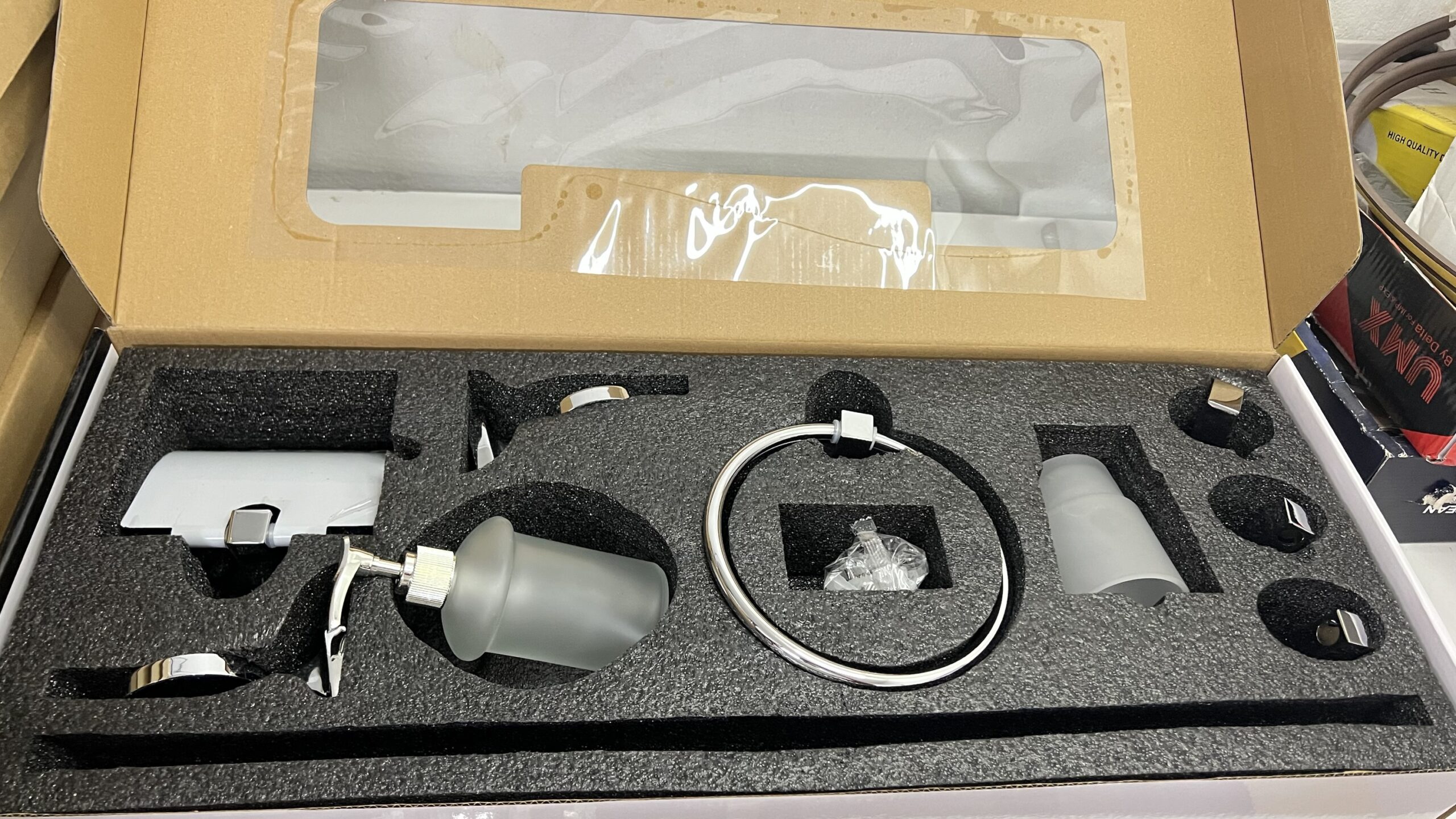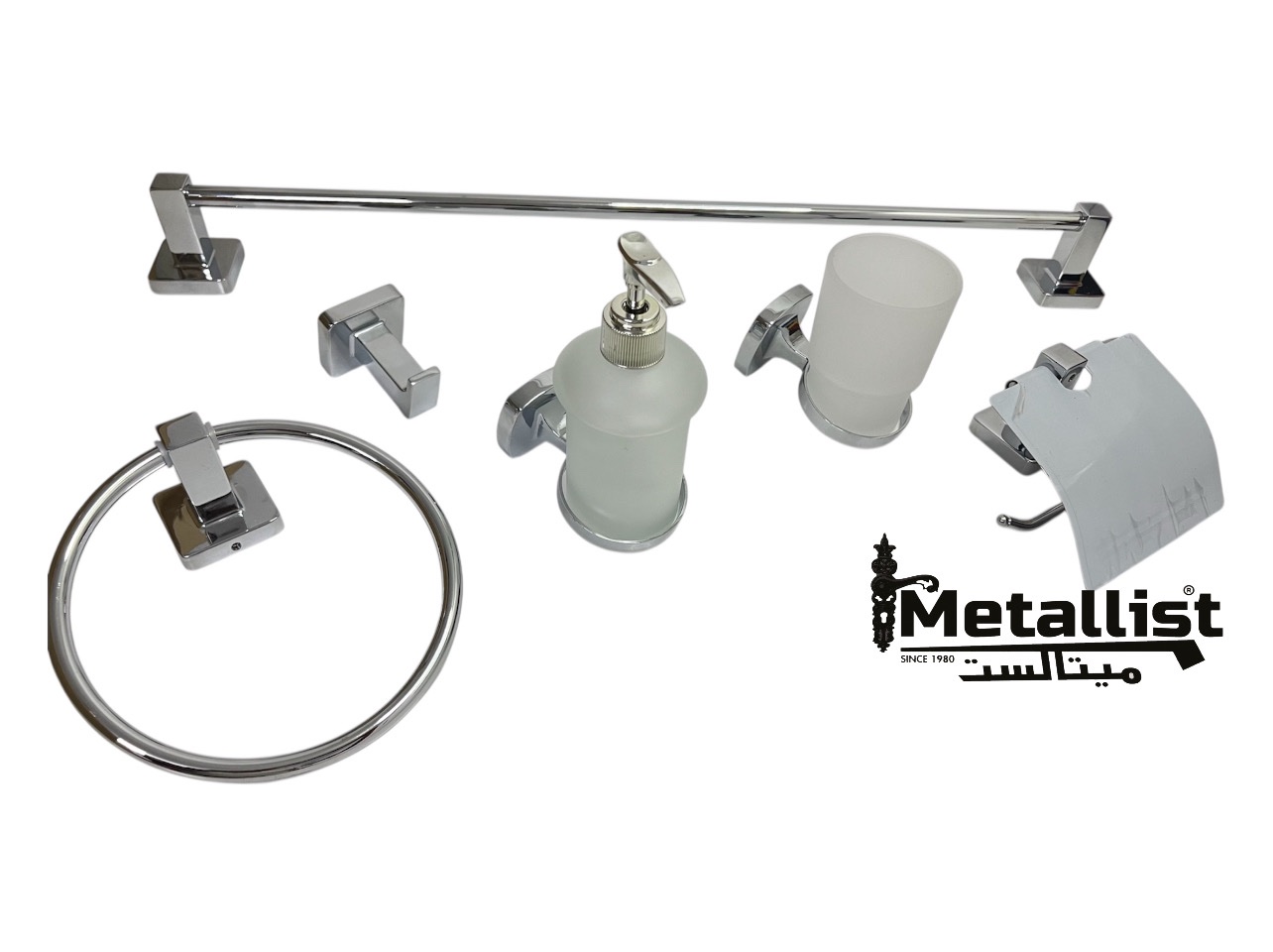 طقم اكسسوار حمام استالس مصنوع من الاستالس المعالج ضدد الصداء مكون من6 قطع –فواطة –شماعه –وراقة –حامل كوب لفرش الاسنان –صبانة شاور –فواطة صغيرة